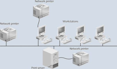 Printer Sharing: Sharing peripherals, such as printers, can increase the efficiency of managing resources and reduce costs for an organization. Sharing other peripheral devices, such as fax machines, works in a similar manner.